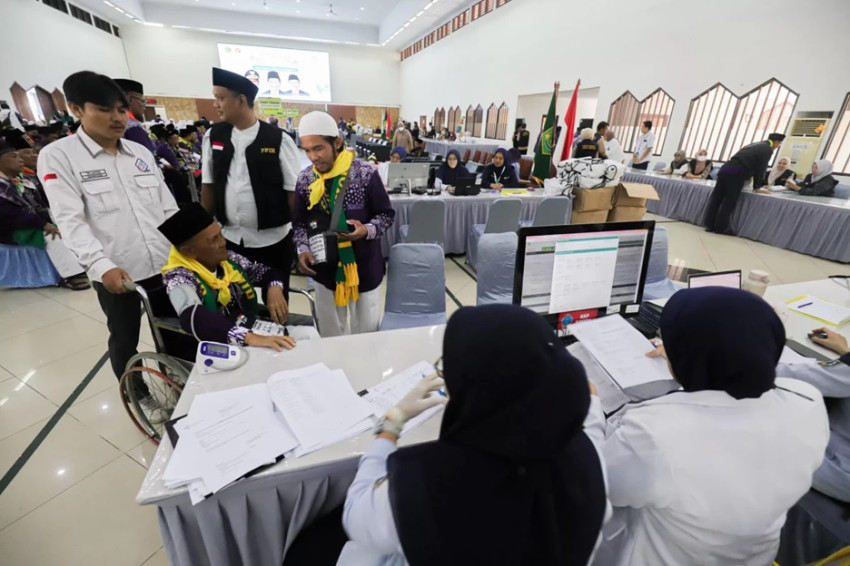 biro haji mengumpulkan calon jemaah di terminal keberangkatan